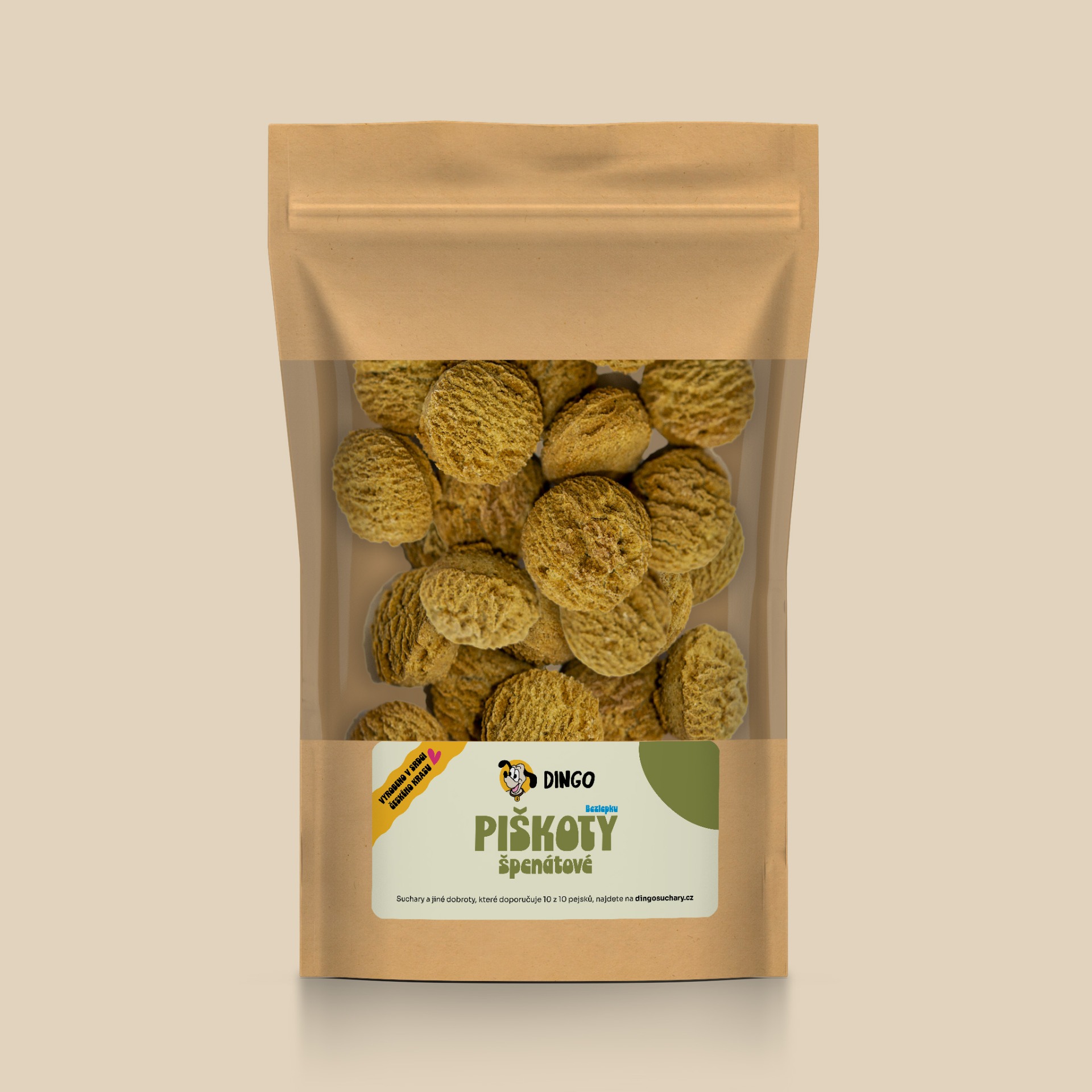 Složení špenát: Cizrnová a jáhlová mouka (pomalu lisovaná za studena), špenát, hovězí vývar a vaječná melanž.