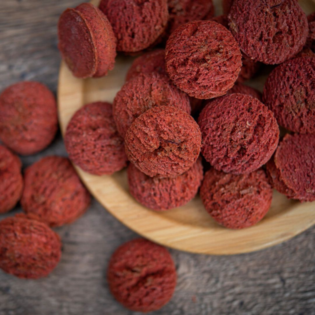 Složení červená řepa: Cizrnová a jáhlová mouka (pomalu lisovaná za studena), červená řepa, jablečné výlisky a vaječná melanž.