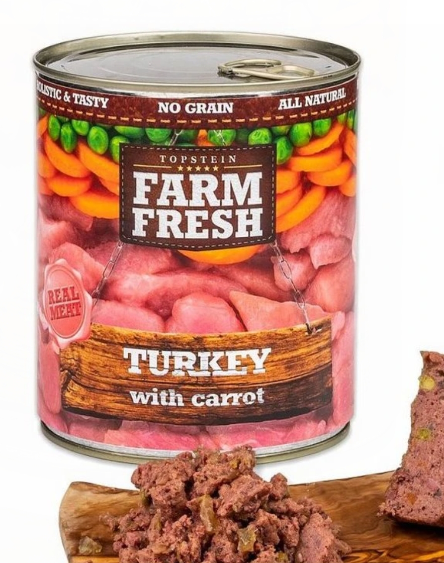 Maso z krůty a její vedlejší produkty živočišného původu, mrkev 5 %, hrášek 4 %, minerální látky 1 %, slunečnicový olej 0,2 %.