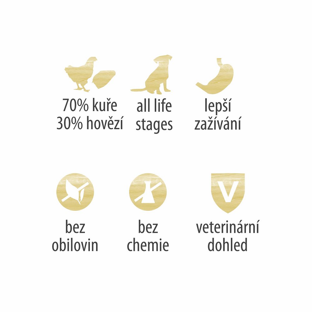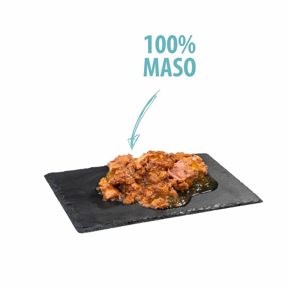 100% maso - Pes nebo kočka je především masožravec. Krmivo se 100% masem je jejich přirozená potrava a tak zaručuje nejvyšší kvalitu a biologickou hodnotu proteinů. To podporuje tvorbu svalů, dobrou kondici a vitalitu.