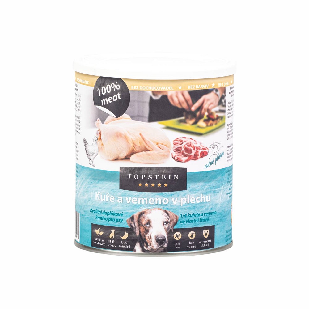 Výtečná konzerva plná celou čtvrtkou kuřete s hovězím vemenem pro dokonalou svačinku přináší pestrost do jídelníčku vašeho mazlíčka. Maso je přirozenou potravou každého masožravce, které zajišťuje potřebný přísun bílkovin se všemi esenciálními aminokyselinami. Pomáhá zlepšit příjem suchého krmiva, doplnit tekutiny a je vhodná při citlivém zažívání i potravních alergiích. Konzervy vynikají nejen svými nutričními a dietními hodnotami, ale také obsahují vysoký podíl vitamínů a minerálů. Ručně plněné konzervy v potravinářské kvalitě jsou pečlivě zpracované a přináší nejvyšší kvalitu vstupních surovin. Konzerva je opatřena plastovým víčkem, které uchovává maso v konzervě čerstvé a zároveň zabraňuje zápachu v lednici, vydrží v chladu minimálně 3 dny. Kuřecí kosti v konzervě nejsou nebezpečné, díky sterilizaci při vysokém tlaku a teplotě jsou zcela měkké a lze je rozmáčknout mezi prsty. Konzerva je čistě přírodním produktem té nevyšší kvality!