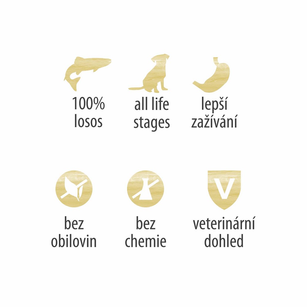 Losos - Losos je velmi bohatý na živočišné bílkoviny, které jsou nezbytné pro tvorbu a opravu svalové hmoty a kostí a k tvorbě potřebných hormonů a enzymů. Má vysoký obsah omega-3 mastných kyselin - podporují zdraví kloubů a snižují zánětlivé procesy v těle. obsahuje také řadu důležitých vitamínů a minerálů, jako je vitamín D, vitamín B12 a selen, které mohou pomoci udržet zdraví kostí, imunitního systému a metabolismu psa. Losos je také snadno stravitelný.